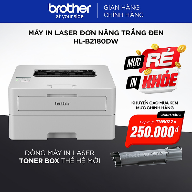 Brother HL-B2180DW là mẫu máy in laser đơn sắc thế hệ mới, được thiết kế để định nghĩa lại khái niệm "in ấn tiết kiệm" cho các doanh nghiệp vừa và nhỏ. Thuộc dòng Toner Benefit, máy không chỉ sở hữu hiệu năng mạnh mẽ mà còn giúp tối ưu hóa chi phí vận hành đến mức tối đa nhờ công nghệ mực in chính hãng giá rẻ.