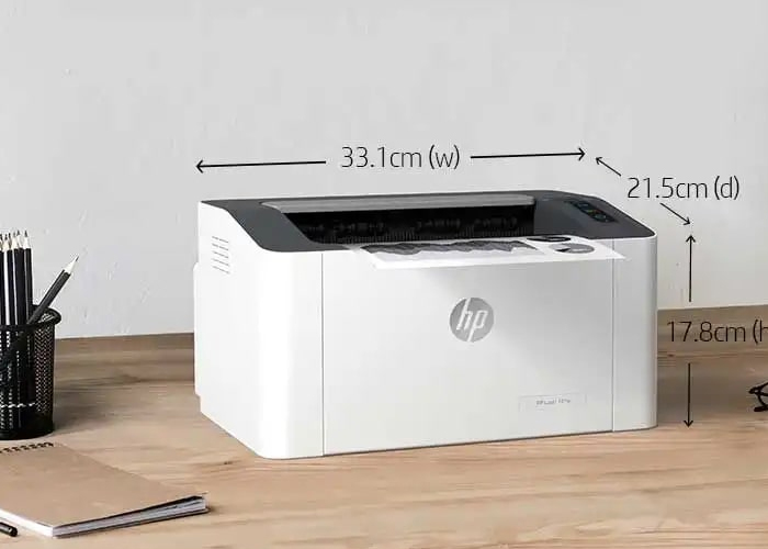 Một trong những ưu điểm lớn nhất của HP LaserJet 108A là thiết kế cực kỳ nhỏ gọn. Với kích thước được tối ưu hóa, chiếc máy này có thể dễ dàng đặt trên bàn làm việc, kệ sách hoặc góc phòng mà không chiếm nhiều diện tích.